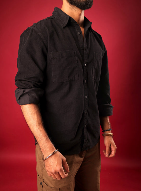 Experience the opulent texture of 'The Abyssal Black Corduroy Shirt.' This shirt is a testament to the depth and richness of black corduroy, with its distinct ridges and velvety feel. Feel the luxurious comfort and the undeniable style as you wear this piece. The 'abyssal' black adds a touch of mystery, making this shirt a standout addition to any wardrobe.